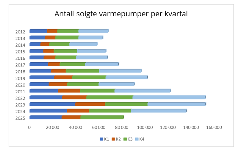 Etter to år med salgsrekorder i 2022 og 2023 som følge av rekordhøye strømpriser, har den svært gunstige strømstøtten og lavere strømpriser for husholdningene bidratt til at etterspørselen etter varmepumper har falt. Det er kun salget til næring som viser vekst, da disse fortsatt betaler markedspris for strømmen. Usikkerhet knyttet til politisk styrte fastpriser, som «Norgespris», har også bidratt til at mange husholdninger har avventet med å investere i varmepumper.